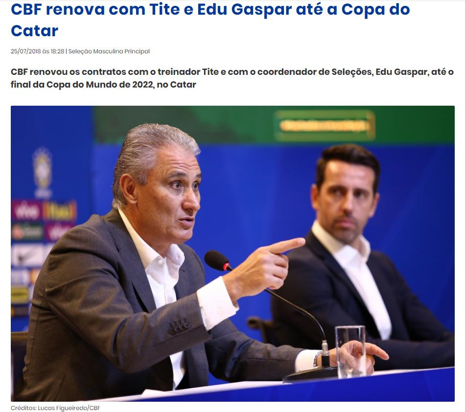 "The CBF has renewed the contract with coach Tite until the end of the 2022 World Cup in Qatar," wrote the CBF on its website.