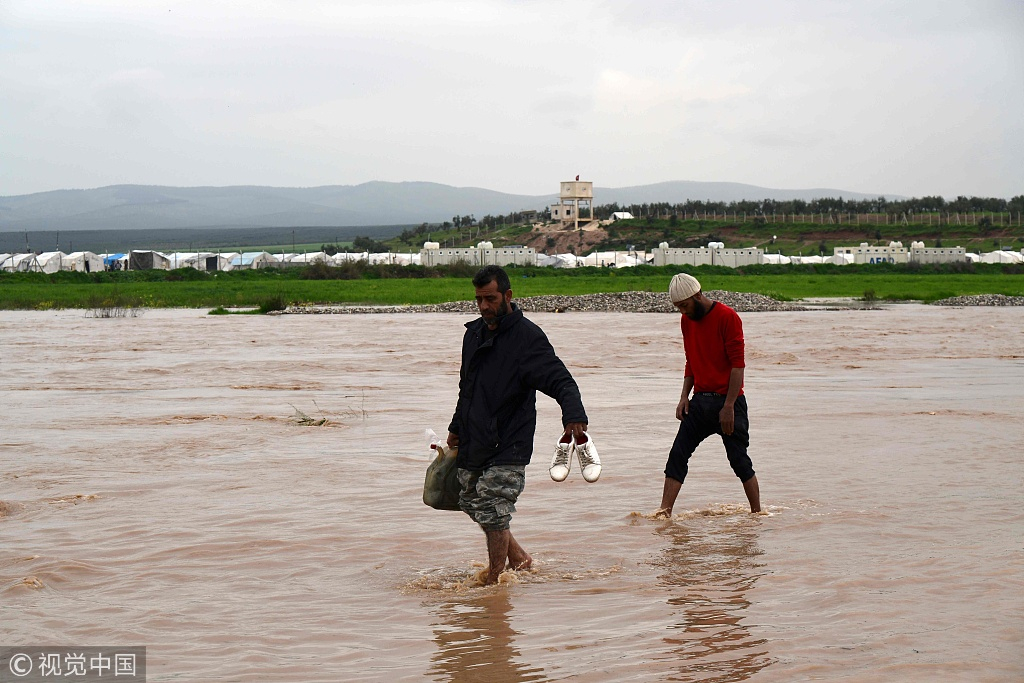 Displaced Syrians cross a flooded area near Deir al-Ballut refugee camp in Afrin's countryside, along Syria's northern border with Turkey, March 31, 2019. /VCG Photo