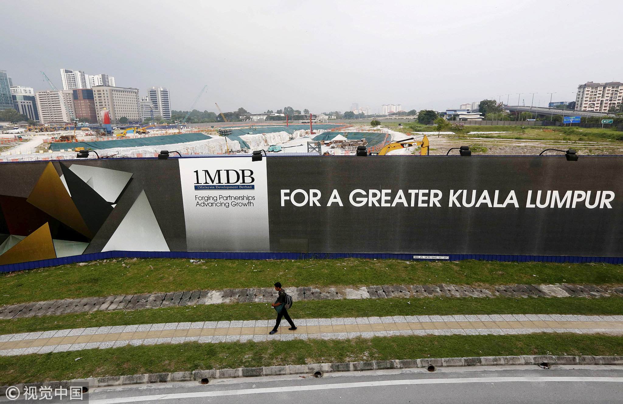 A man walks past a 1 Malaysia Development Berhad (1MDB) billboard at the funds flagship Tun Razak Exchange development in Kuala Lumpur, March 1, 2015. /VCG Photo