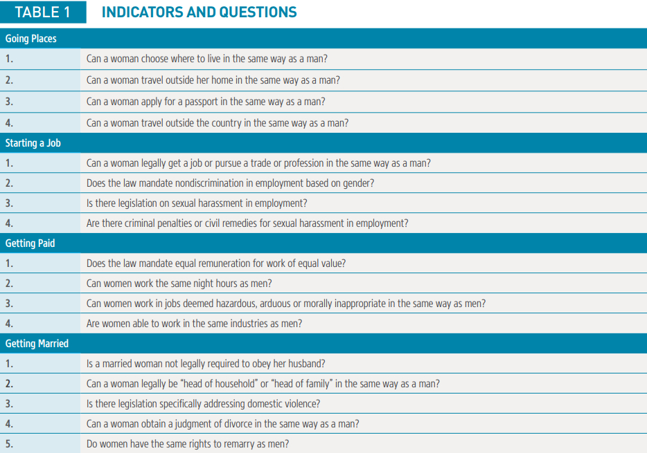 And the criteria was broken down into questions such as: "Can a woman choose where to live in the same way as a man?" and "Is there legislation on sexual harassment in employment?"
