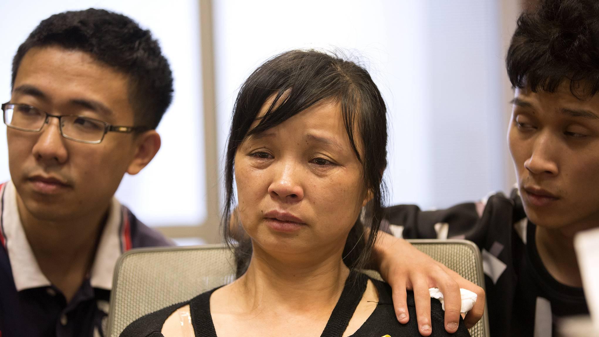 File: Ye Lifeng, mother of Zhang Yingying sits with her son (R) and Hou Xiaolin, Yingying's boyfriend (L), after a news conference on Tuesday, 22 August 2017. /VCG Photo