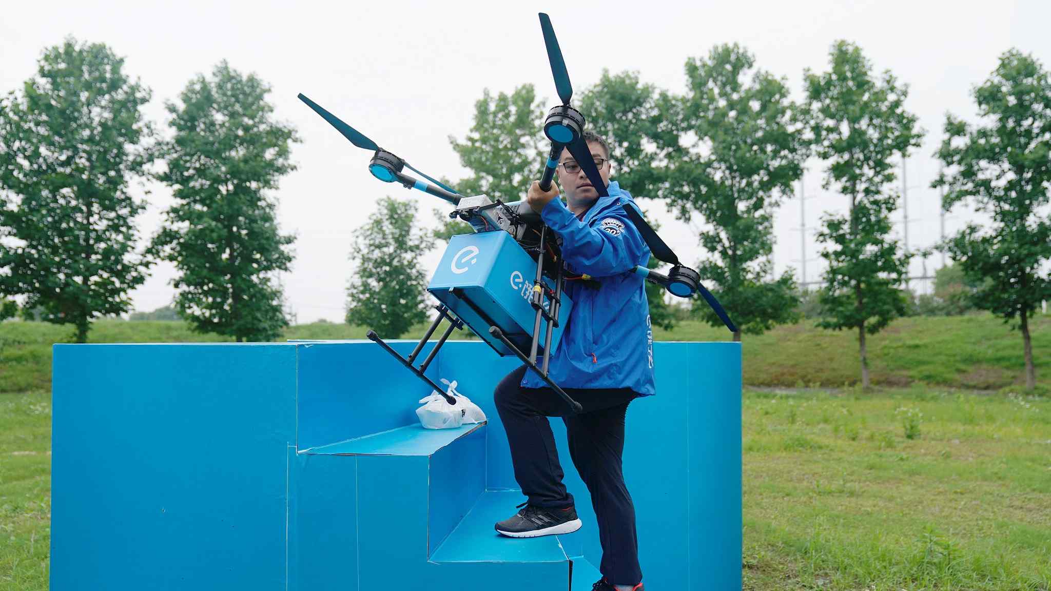 During the trial, one delivery man will first put food orders in the drone, and another will retrieve it at the end of the trip to complete the delivery to the costumer’s door. The drone is expected to travel for 70 percent of the total trip, which is about 50 kilometers. /VCG Photo