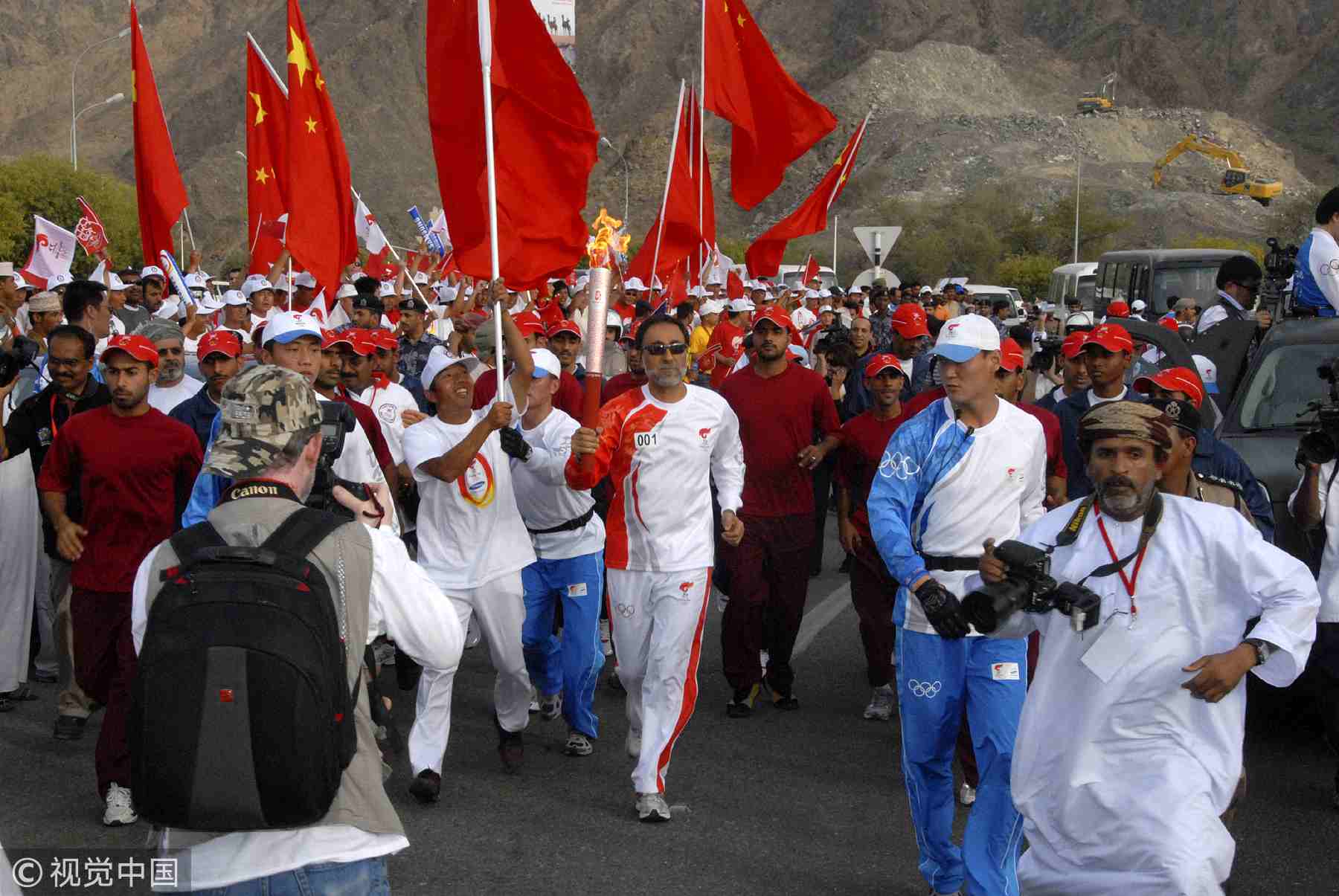 Sayyid Shihab, adviser to Oman's Sultan Qaboos Bin Saeed, runs with the Olympic torch at the start of the torch relay in Muscat April 14, 2008. /VCG Photo
