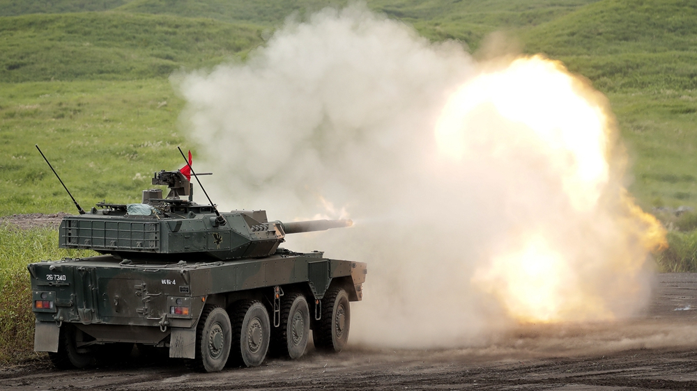 A Japan Ground Self-Defense Force (JGSDF) Type 16 mobile combat vehicle fires shot during a live fire exercise at the foot of Mount Fuji in the Hataoka district of the East Fuji Maneuver Area in Gotemba, Shizuoka Prefecture, Japan, Aug. 25, 2018. /VCG Photo