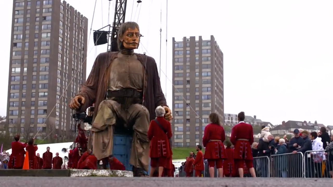 On the opposite side of the River Mersey, another giant emerged on the beach at New Brighton, a seaside resort popular with people in the city region.