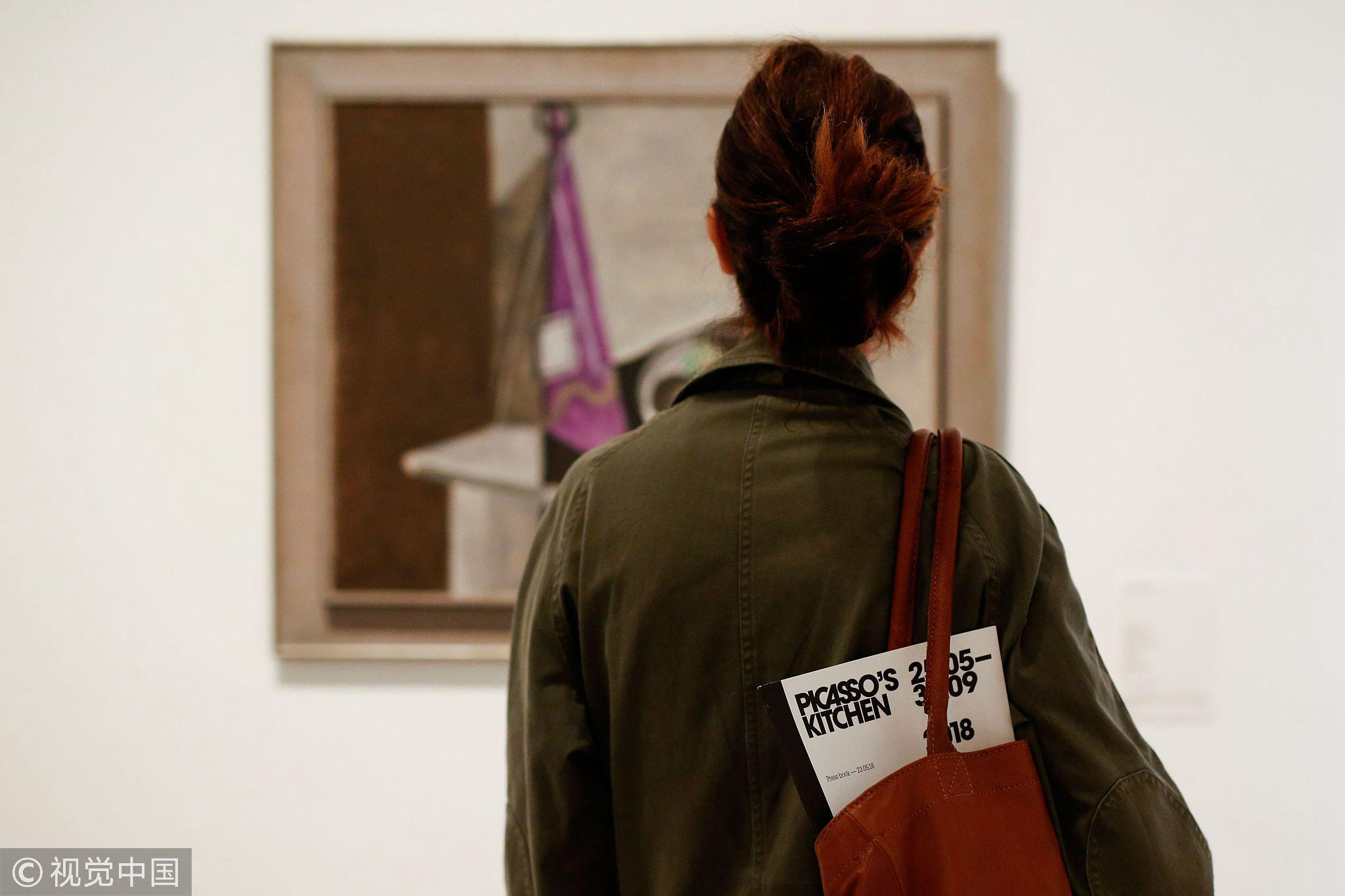 A visitor looks at a painting by Spanish artist Pablo Picasso during the presentation of the exhibition "Picasso's Kitchen" at the Picasso Museum in Barcelona on May 23, 2018. /VCG Photo