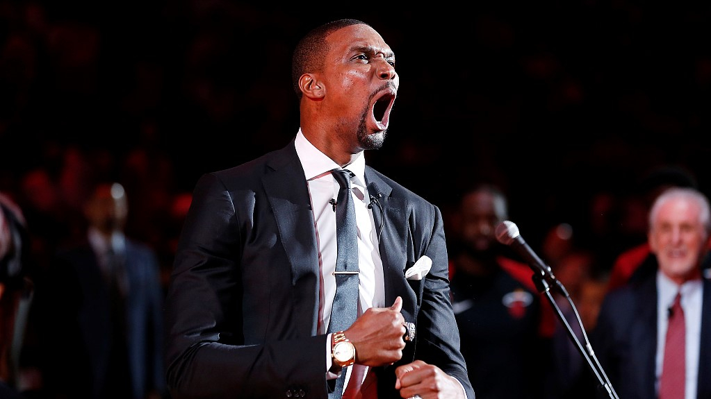 Bosh makes his signature scream at the jersey retiring ceremony, March 26. /VCG Photo
