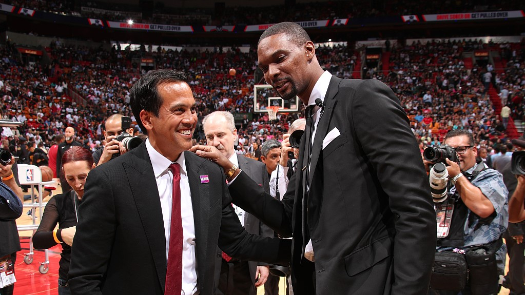Chris Bosh (R) and head coach Erik Spoestra of the Miami Heat at the jersey retiring ceremony, March 26 /VCG Photo