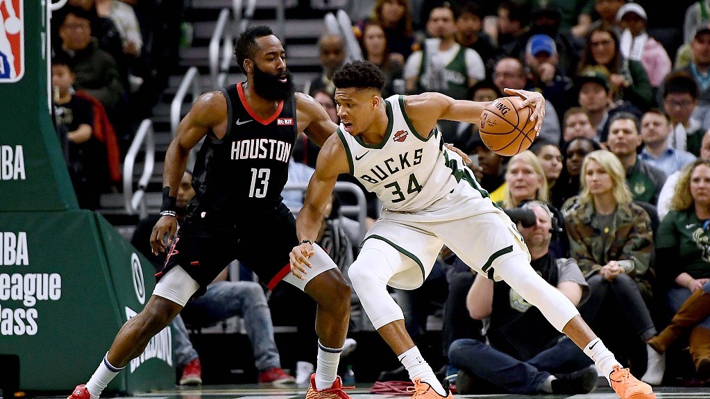 James Harden #13 of the Rockets under the defense of Antetokounmpo of the Bucks, March 26. /VCG Photo