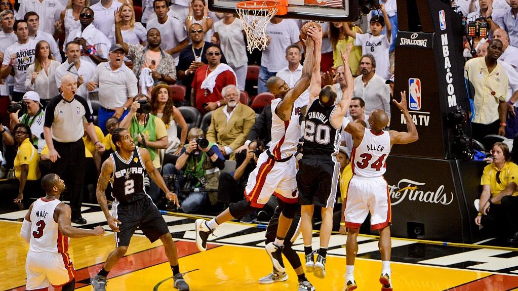 Bosh of the Heat grabs the valuable offensive rebound that leads to the game tying three-pointer by Ray Allen in Game 6 of the 2012-13 NBA Finals against the San Antonio Spurs. /VCG Photo