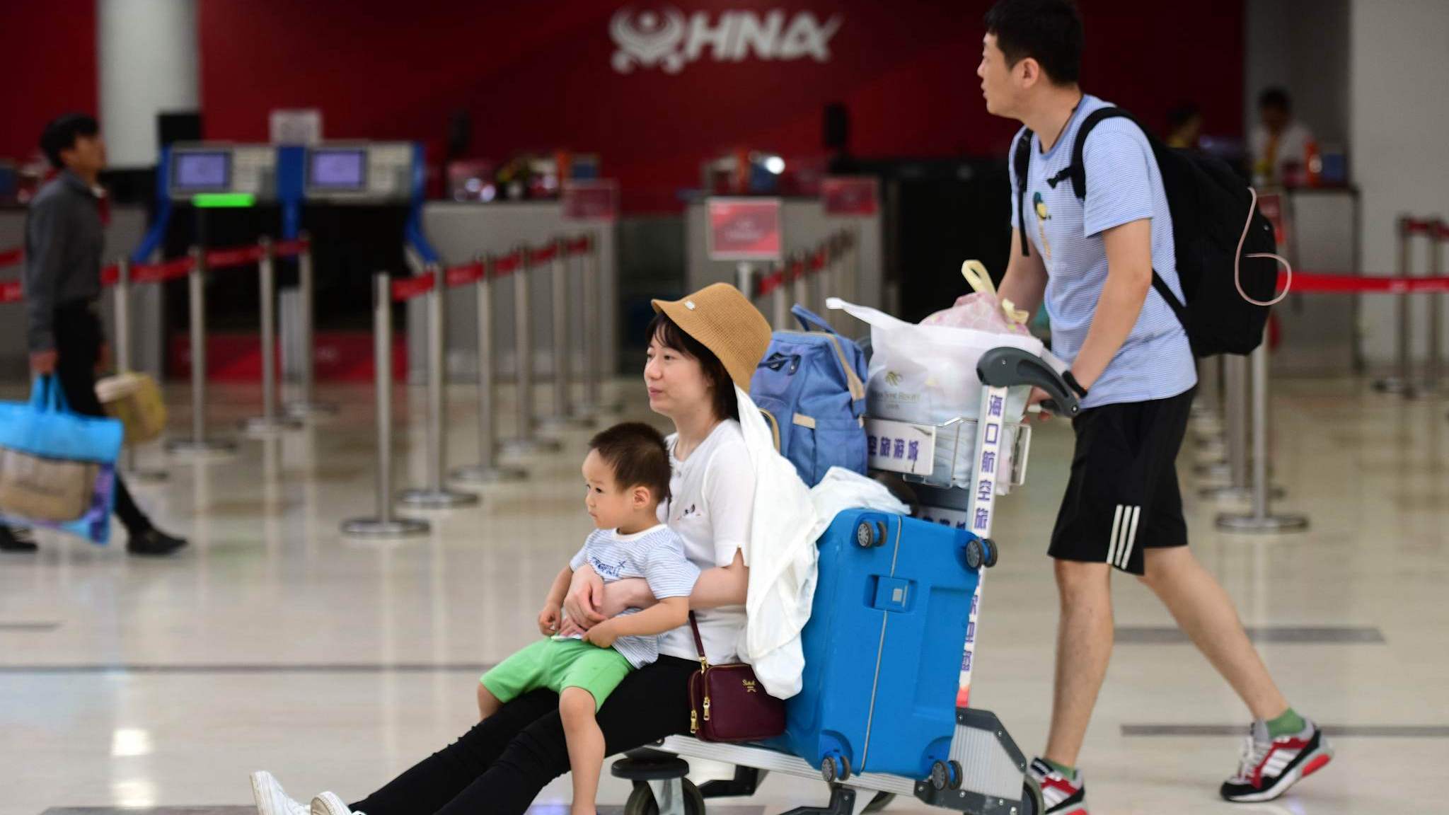 A family of passengers were spotted at the Hainan Meilan International Airport in Haikou City of south China's Hainan Province on April 29. /VCG Photo