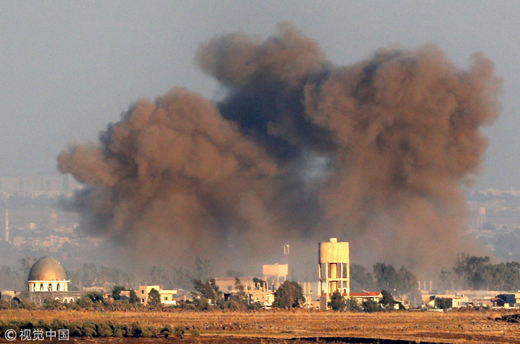 Smoke rises above buildings across the border in Syria during air strikes backing a government-led offensive in the southern province of Quneitra, July 26, 2018. /VCG Photo