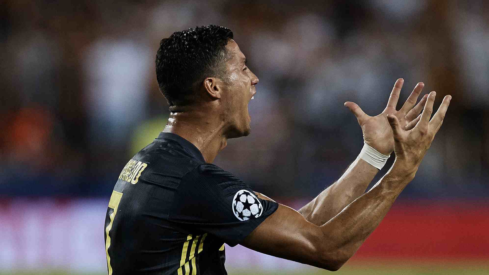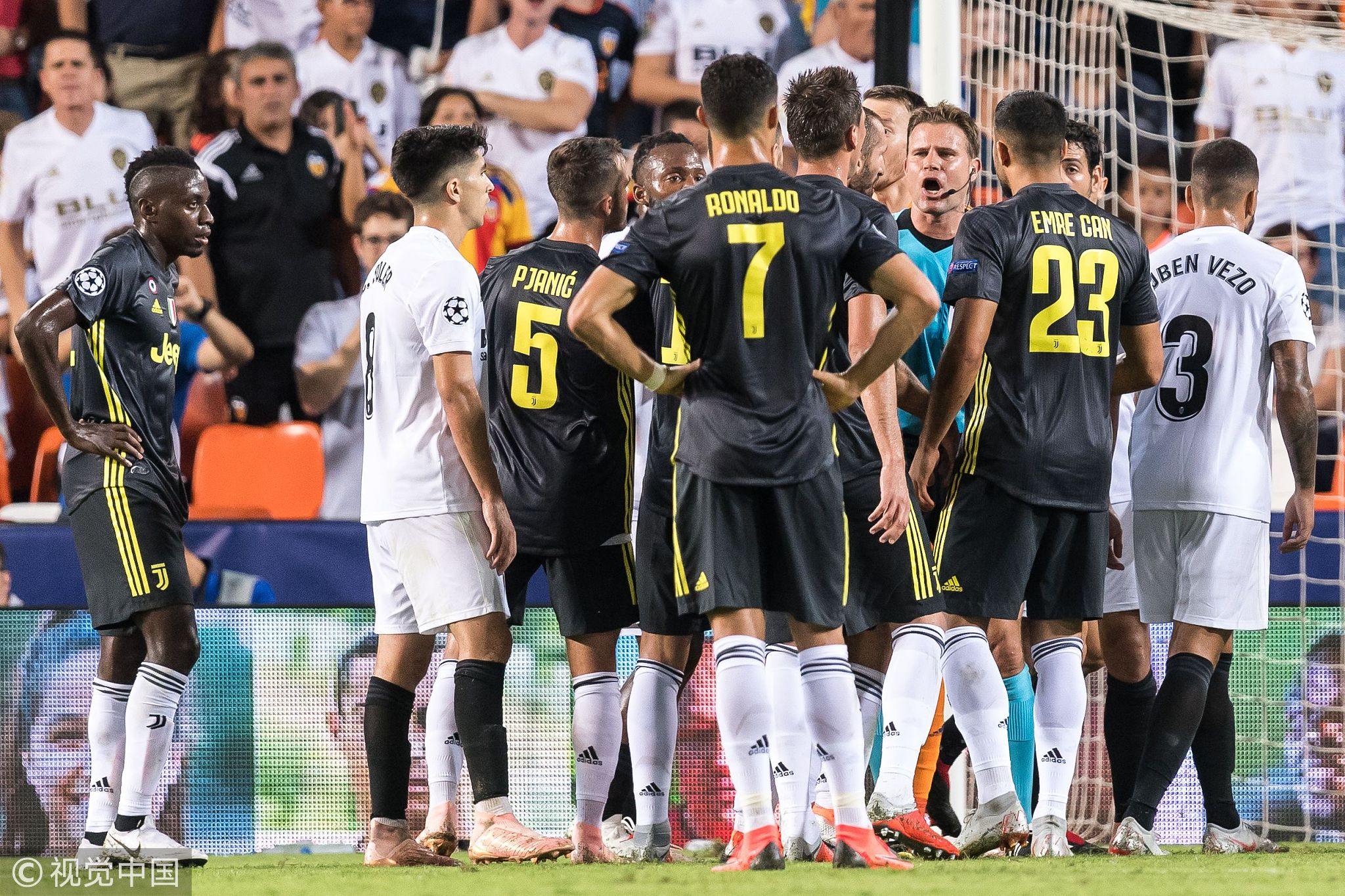 Referee Felix Brych gave a red card to Cristiano Ronaldo during the UEFA Champions League group H match between Valencia and Juventus, September 19, 2018. /VCG Photo