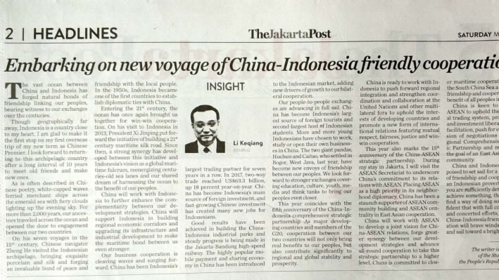 A signed article by Chinese Premier Li Keqiang titled Embarking on A New Voyage of China-Indonesia Friendly Cooperation was published on Saturday in the most popular Indonesian English newspaper The Jakarta Post.
