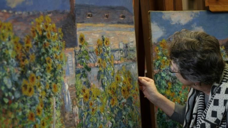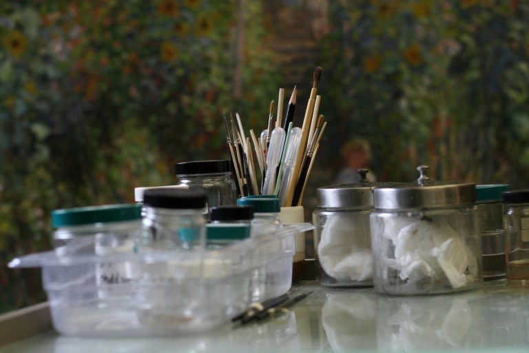 Solvents and conservation tools are seen in front of " The Artist's Garden at Vetheuil" (1881) by Claude Monet at the National Gallery of Art's conservation laboratory. /AFP Photo