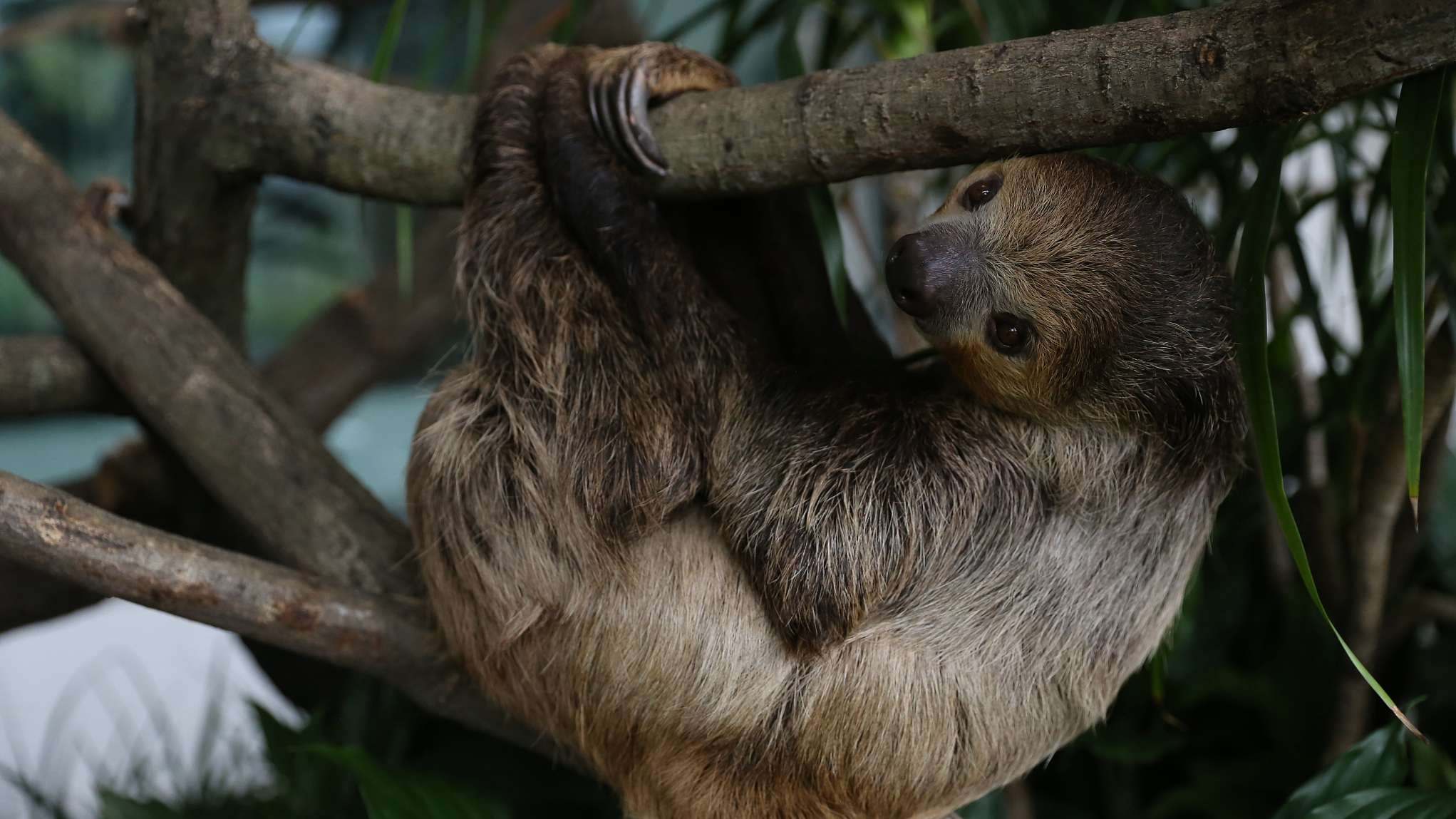 A sloth is looking at the visitors on a tree branch. /VCG Photo