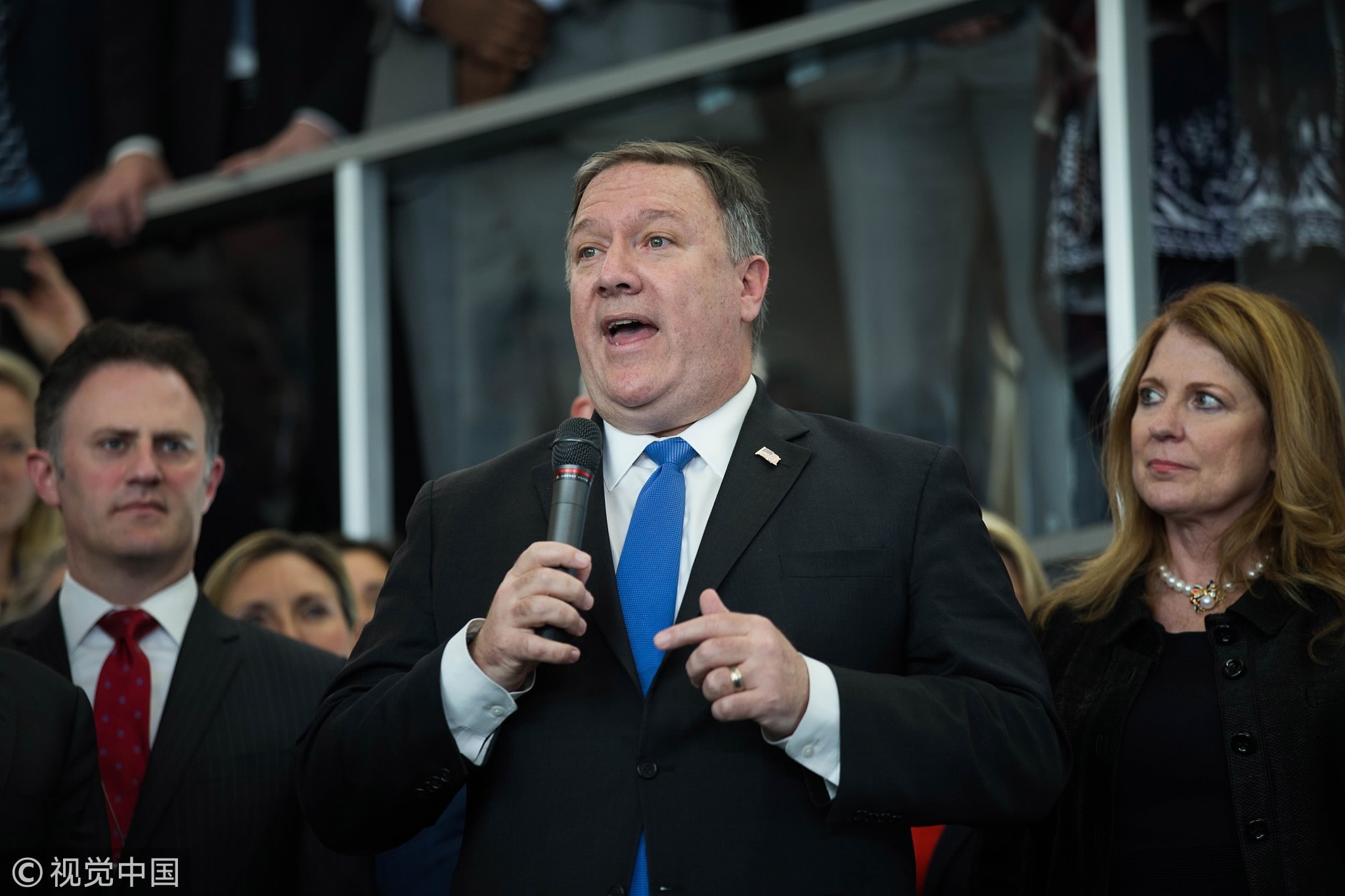 US Secretary of State Mike Pompeo (C) makes remarks during a welcome ceremony with his wife Susan Pompeo (R) in the lobby of the Harry S. Truman Building, May 1, 2018./VCG Photo