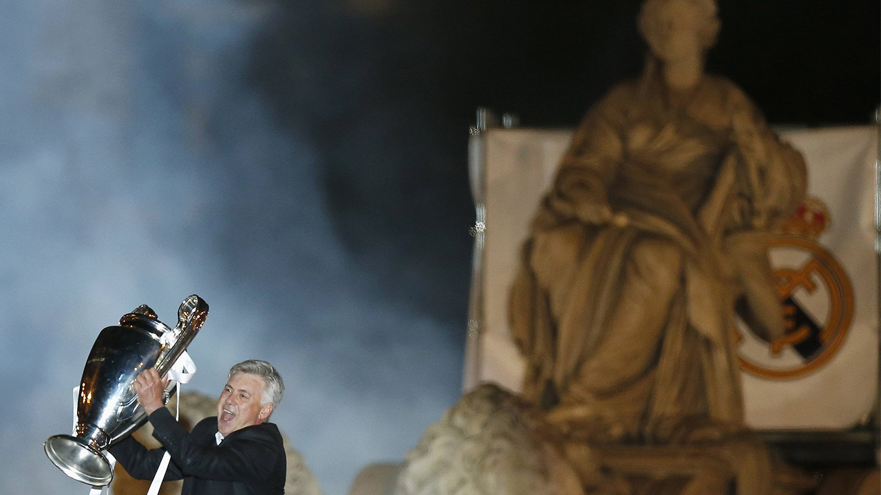 Real Madrid's coach Carlo Ancelotti celebrates with the trophy after winning their Champions League final soccer match against Atletico Madrid, next to the Cibeles statue in Madrid, May 25, 2014. /VCG Photo