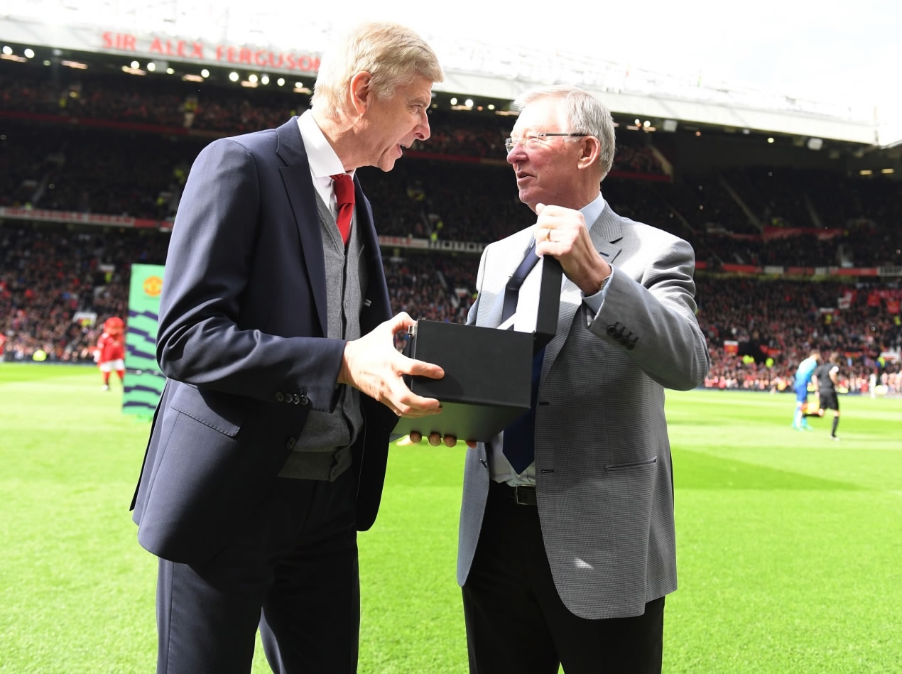 Former Manchester United manager Alex Ferguson presents Arsenal Manager Arsene Wenger with a gift to mark his retirement ahead of the Premier League match between Manchester United and Arsenal at Old Trafford. /VCG Photo