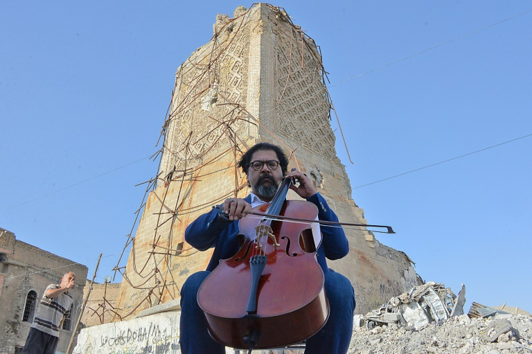 Famed Iraqi maestro and cello player Karim Wasfi performs in front of the Al-Hadba leaning minaret at the Great Mosque of al-Nuri in Mosul’s war-ravaged Old City. /AFP Photo