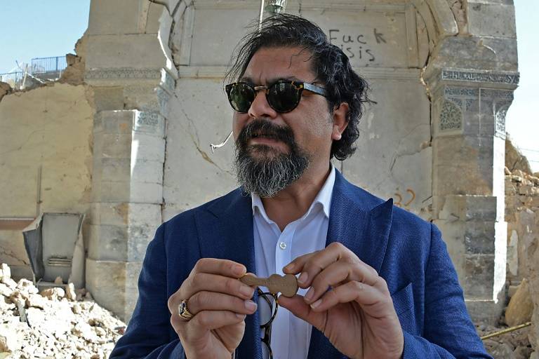 Iraqi cello maestro Karim Wasfi wanders in Mosul's war-ravaged Old City on June 29, 2018. /AFP Photo