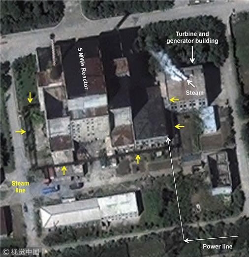 This is a DigitalGlobe image of the five megawatt (electric) reactor at DPRK's Yongbyon facility from August 31, 2013 with steam seen coming from the electrical power generation building. /VCG Photo