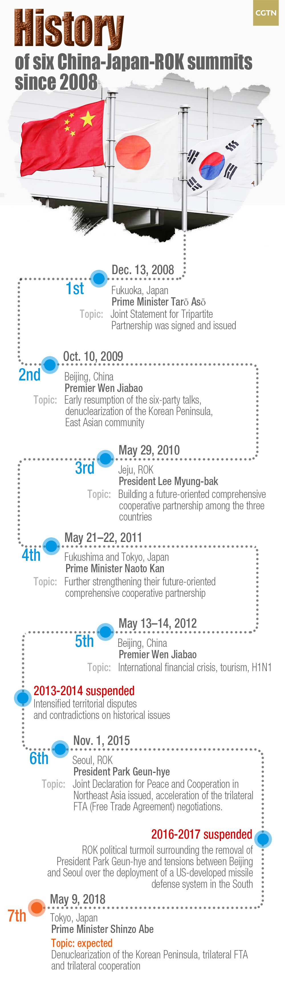With the seventh summit starting on May 9, we've put together a brief history of the previous six summits between China, Japan and ROK below.