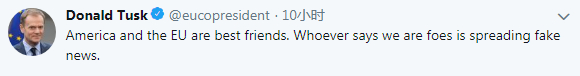 Tusk offered a caustic response, tweeting: "America and the EU are best friends. Whoever says we are foes is spreading fake news."
