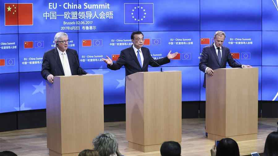 Chinese Premier Li Keqiang, European Council President Donald Tusk and European Commission President Jean-Claude Juncker attend a press conference in Brussels, Belgium, June 2, 2017. /Xinhua Photo