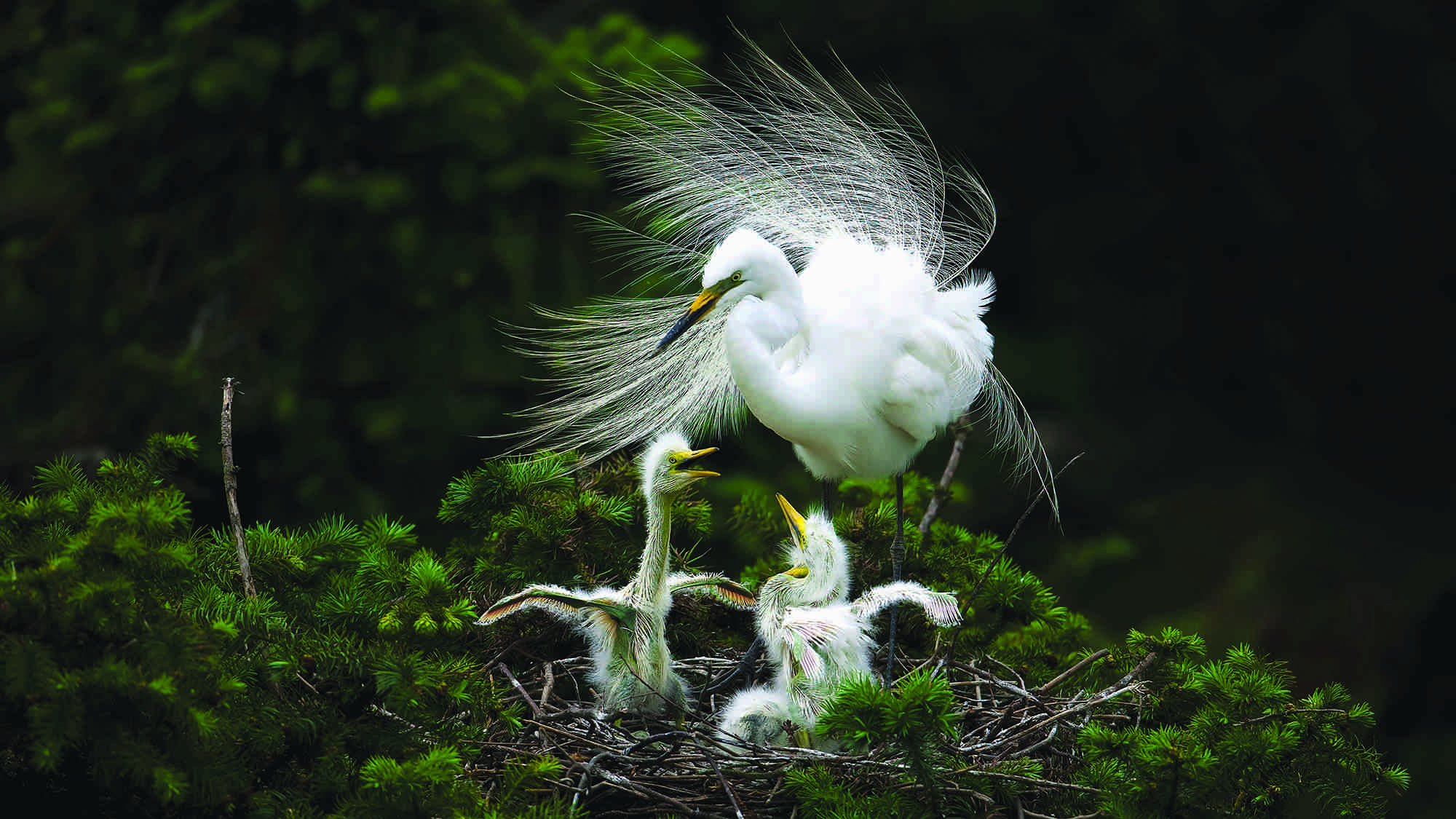 (Top image: In April, in a coniferous pine tree in Jiangsu, a coastal province in China, two newly-hatched little egrets can't wait to be fed by their mother. /Photo by Sun Huajin from Luli Studio)