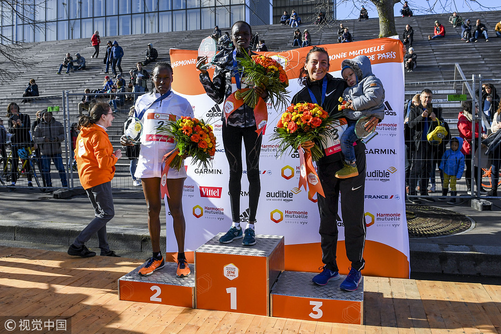 Clemence Calvin (right) celebrates with her son after winning the bronze medal at the Half Marathon in Paris, France, March 10, 2019. /VCG Photo