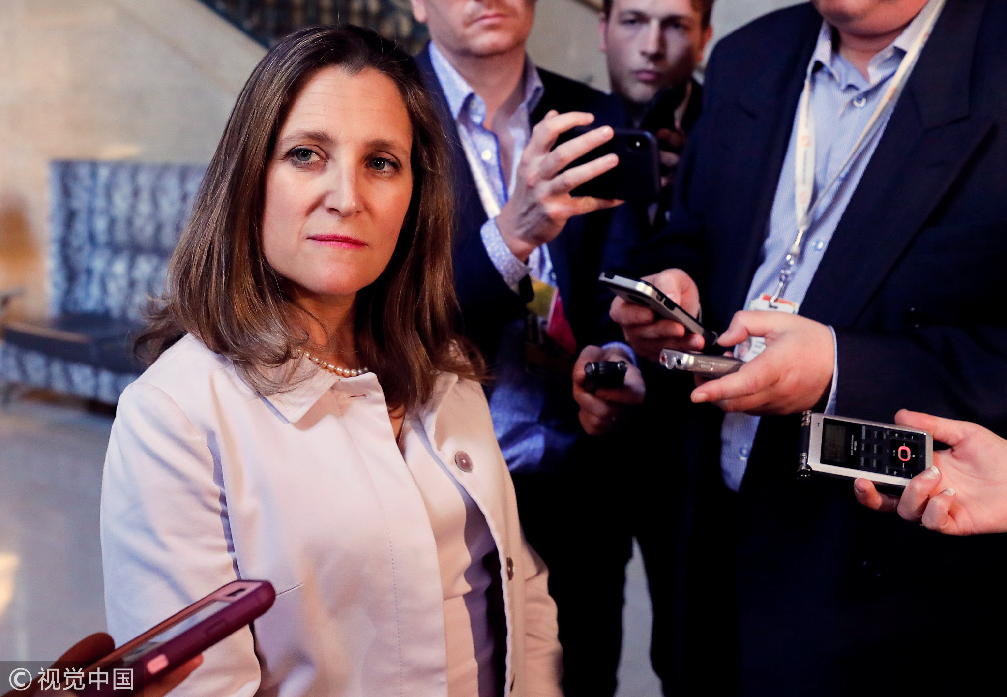 Canadian Foreign Minister Chrystia Freeland speaks to media in Quebec City, Quebec, Canada, June 10, 2018. /VCG Photo