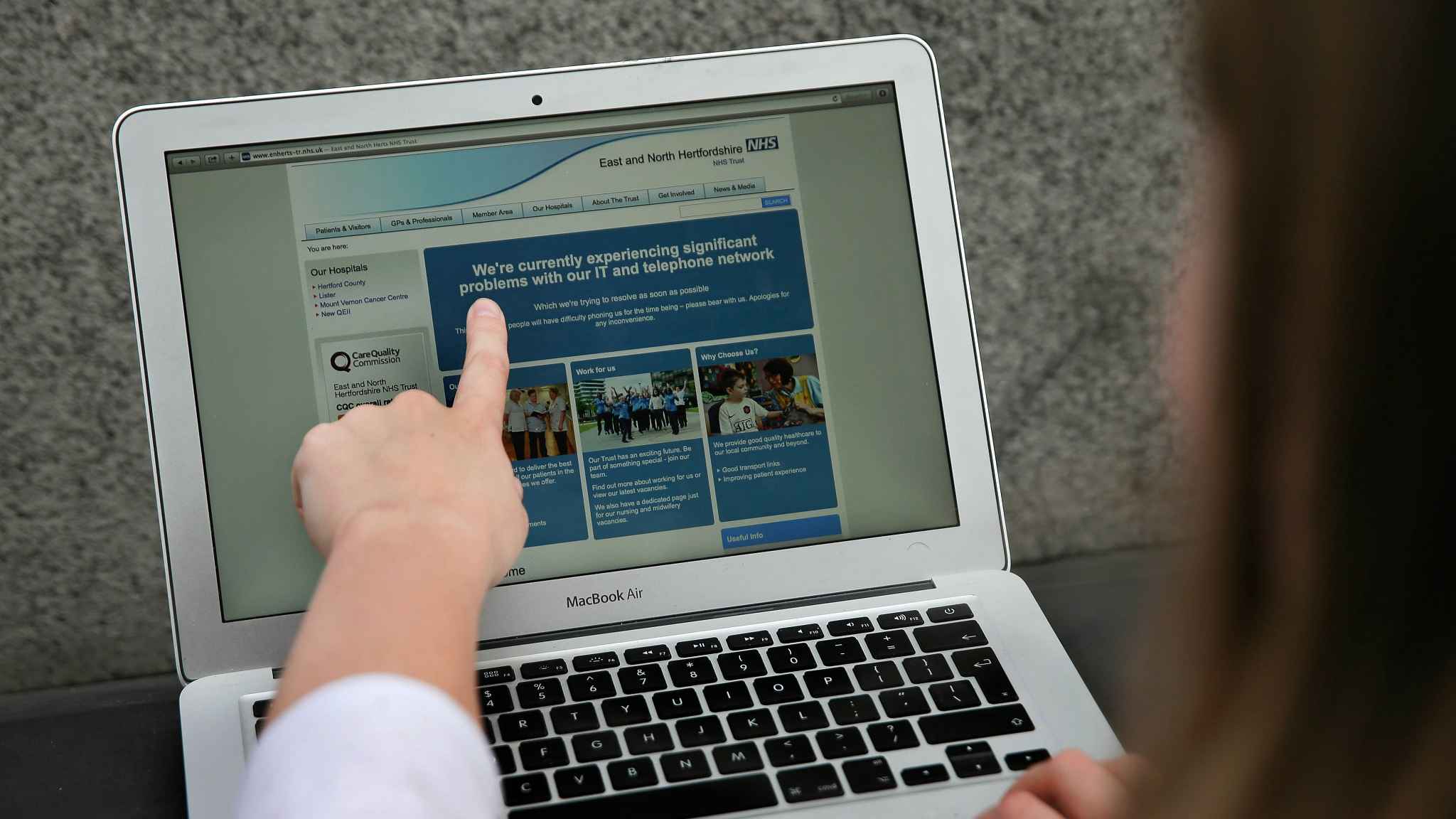 A woman points to the website of the NHS, which notified users of a problem in its network, London on May 12, 2017. /VCG Photo