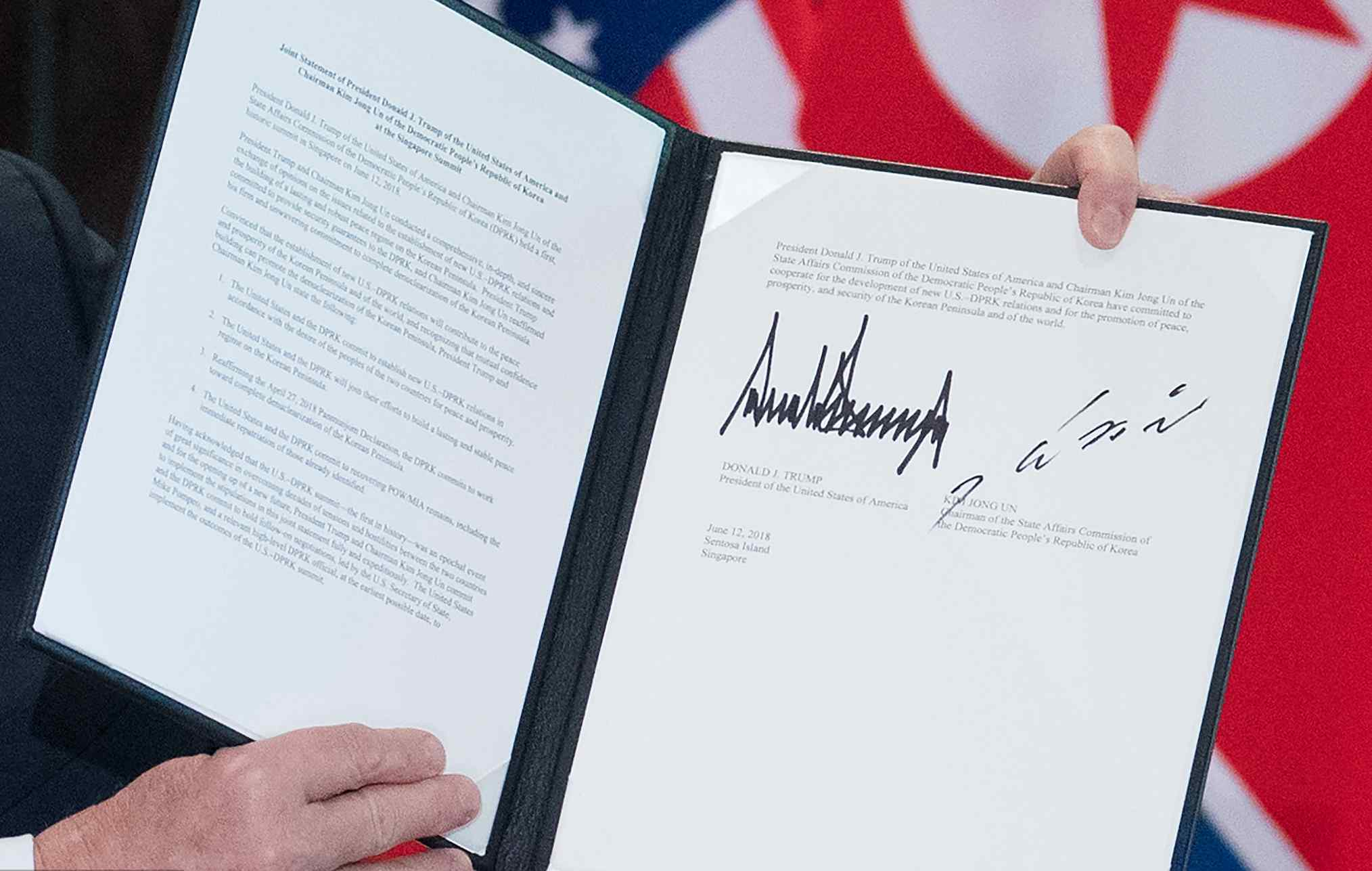 US President Donald Trump holds up a document signed by him and DPRK leader Kim Jong Un following a signing ceremony during their historic US-DPRK summit, at the Capella Hotel on Sentosa Island in Singapore, June 12, 2018. /VCG Photo