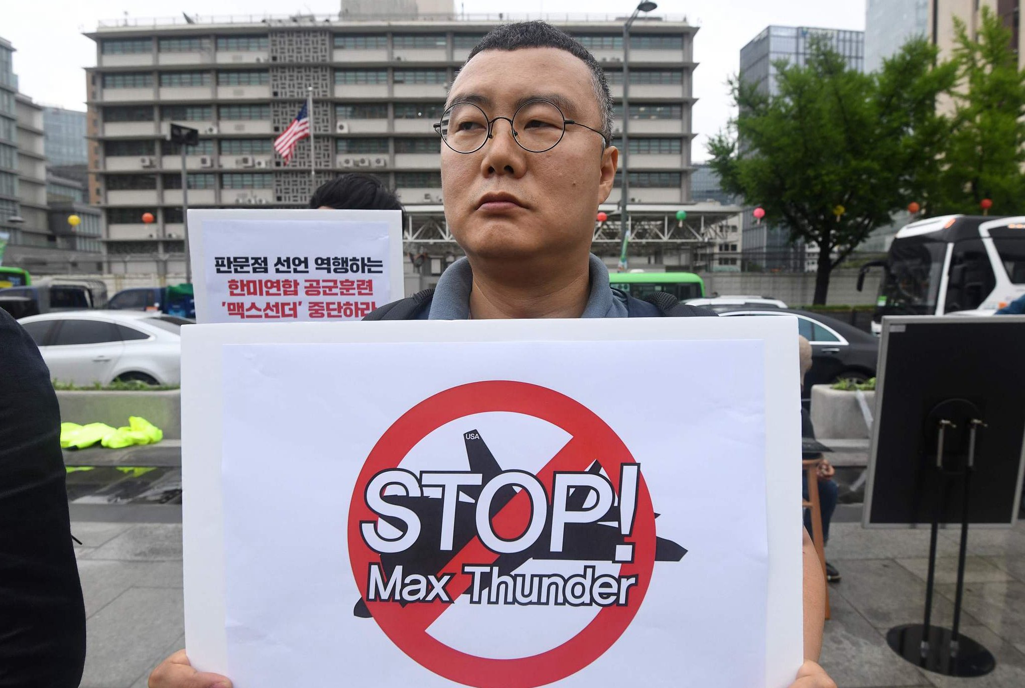 ROK's peace activists hold placards reading "Stop! Max Thunder," during a rally denouncing ROK-US joint military drills, in front of the US embassy in Seoul, May 16, 2018. /VCG Photo