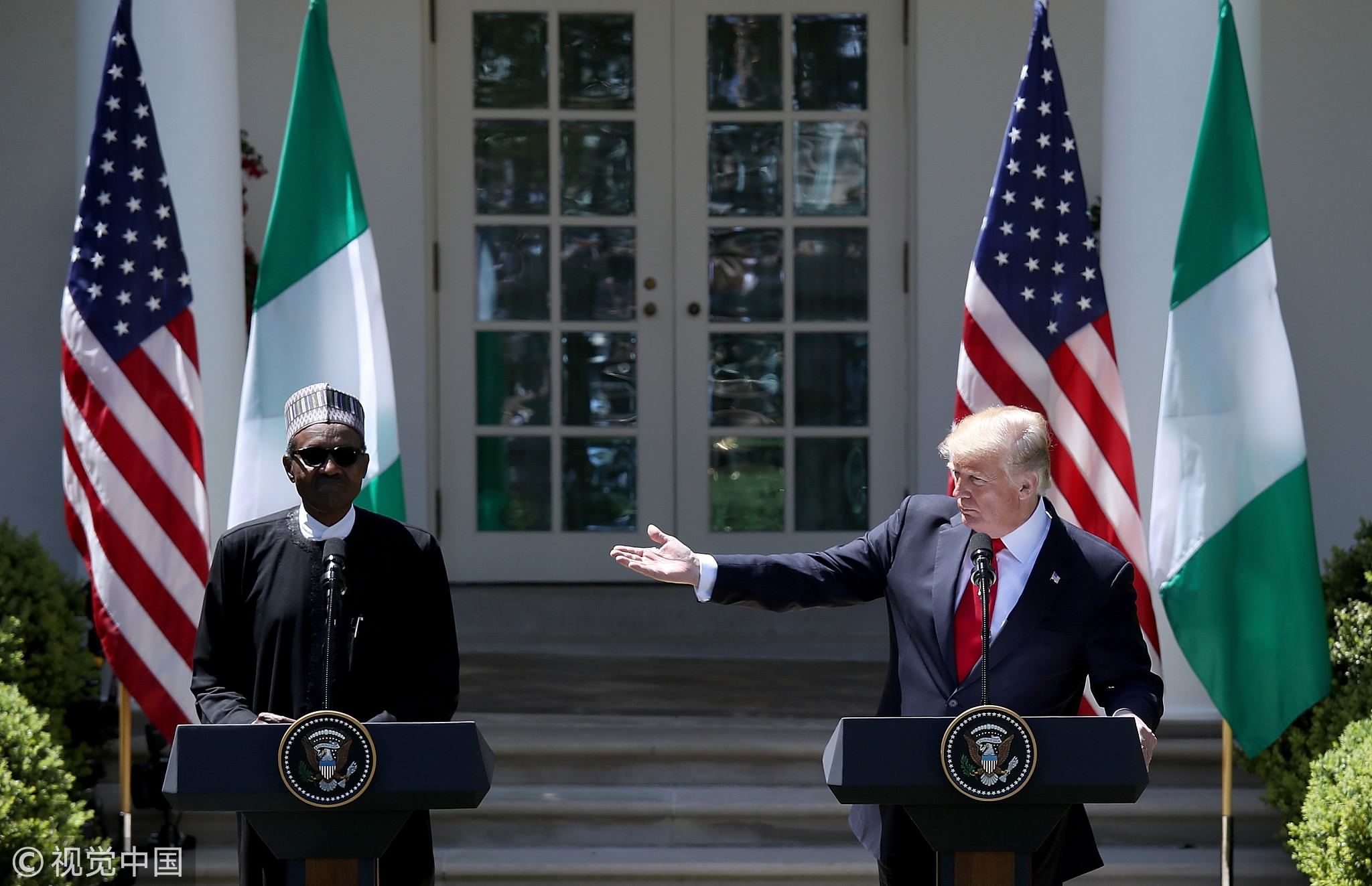 US President Donald Trump (R) and Nigerian President Muhammadu Buhari (L) answers questions during a joint press conference in the Rose Garden of the White House in Washington, DC, on Apr 30, 2018./VCG Photo