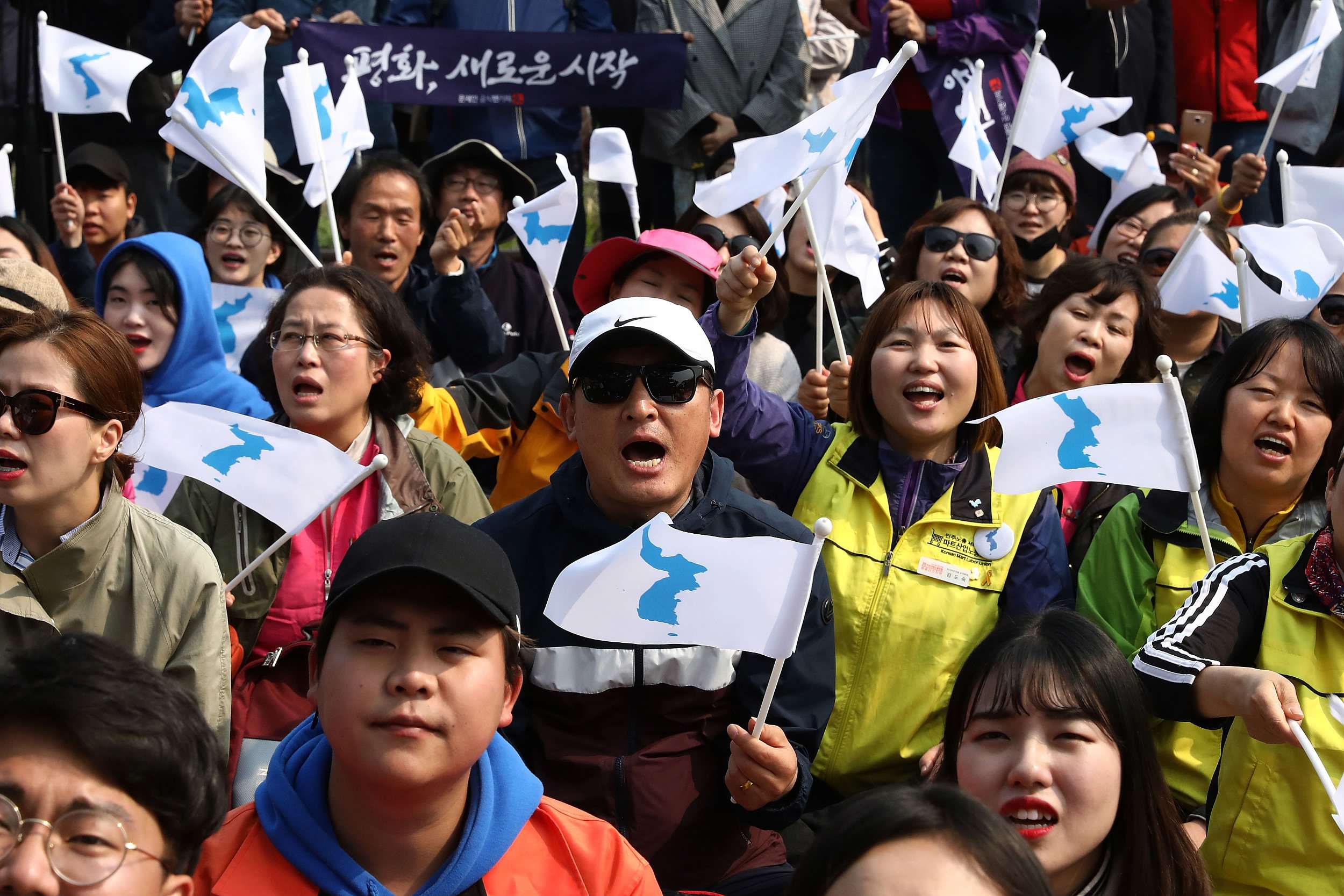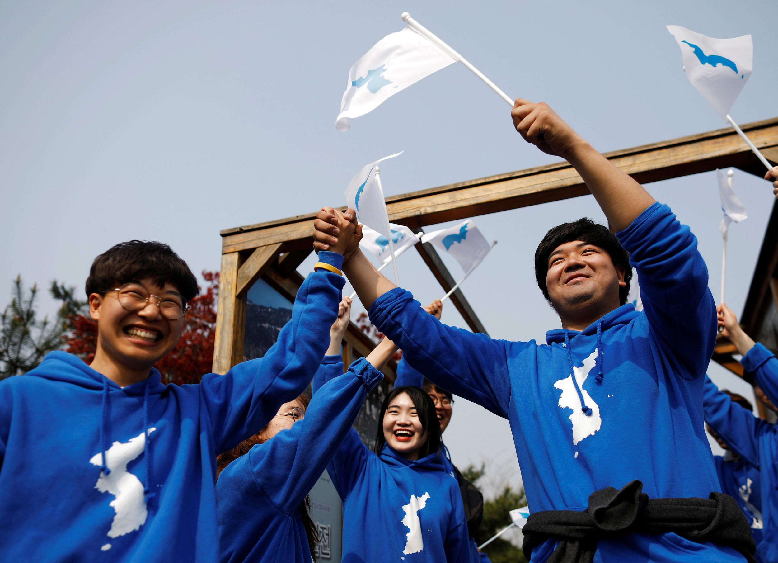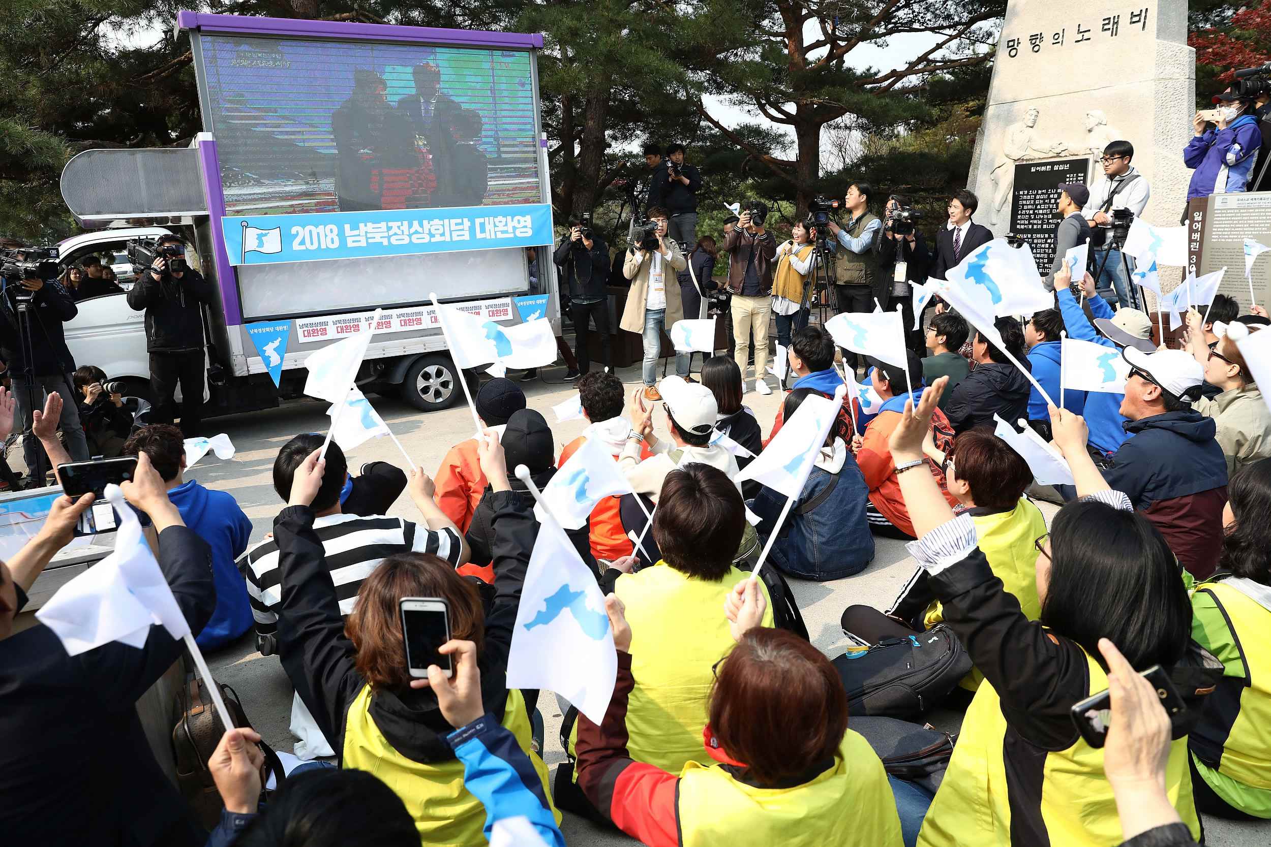 People wave the Korean unification flag during the inter-Korean summit, near the demilitarized zone separating the Democratic People's Republic of Korea (DPRK) and the Republic of Korea (ROK), in Paju, ROK. /VCG Photo