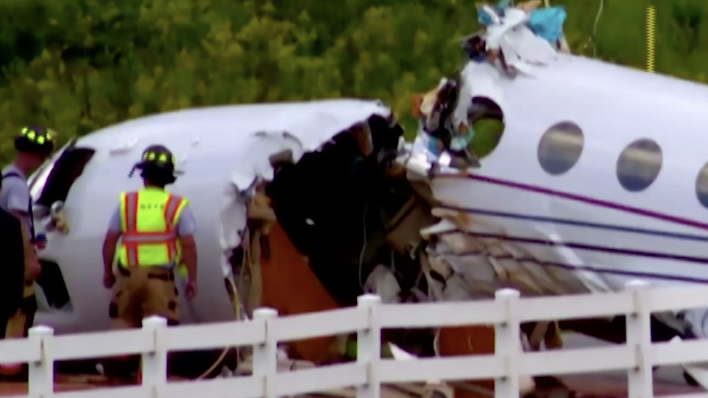 A mid-sized jet that tried to land at the Greenville Downtown Airport in South Carolina, US, ran off the runway and split in two on Thursday, killing the two pilots on board and injuring two passengers.