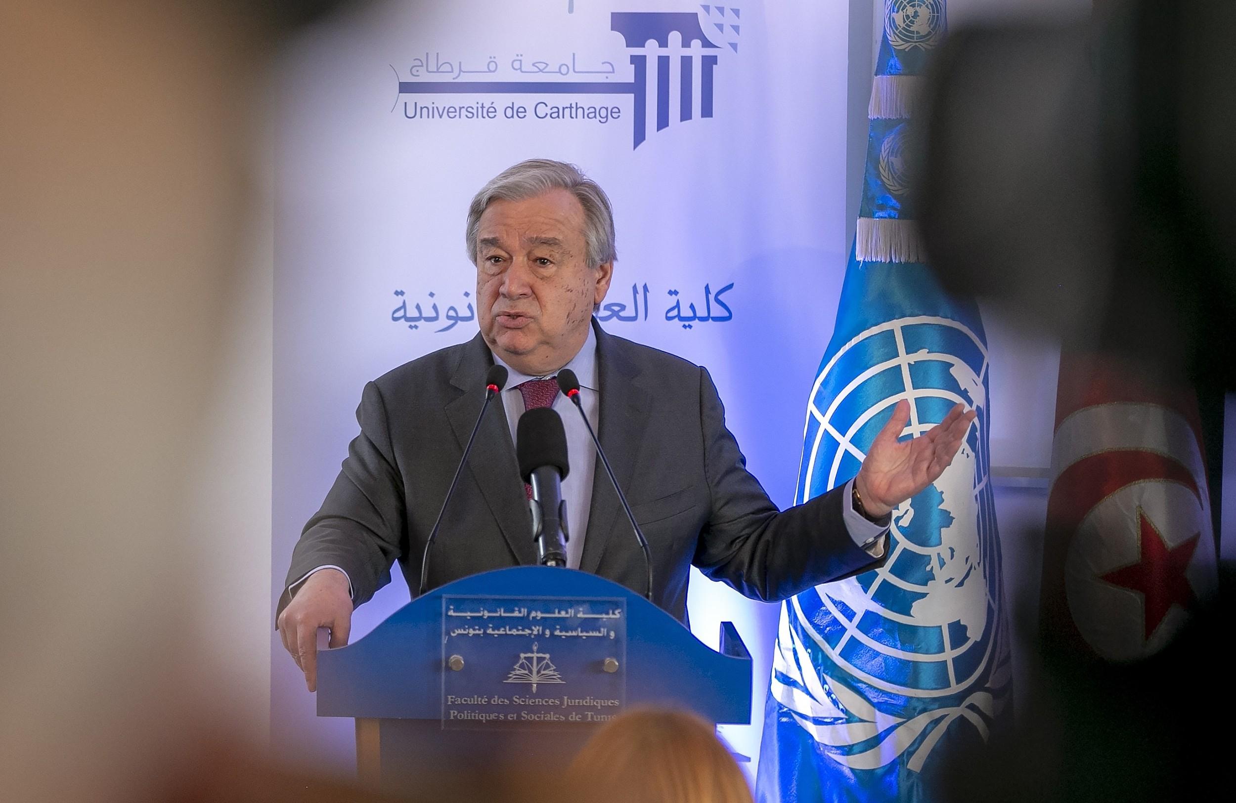 UN Secretary-General Antonio Guterres speaks to students in Faculty of Social and Political Science within his visit in Tunis, Tunisia, April 1, 2019. /VCG Photo