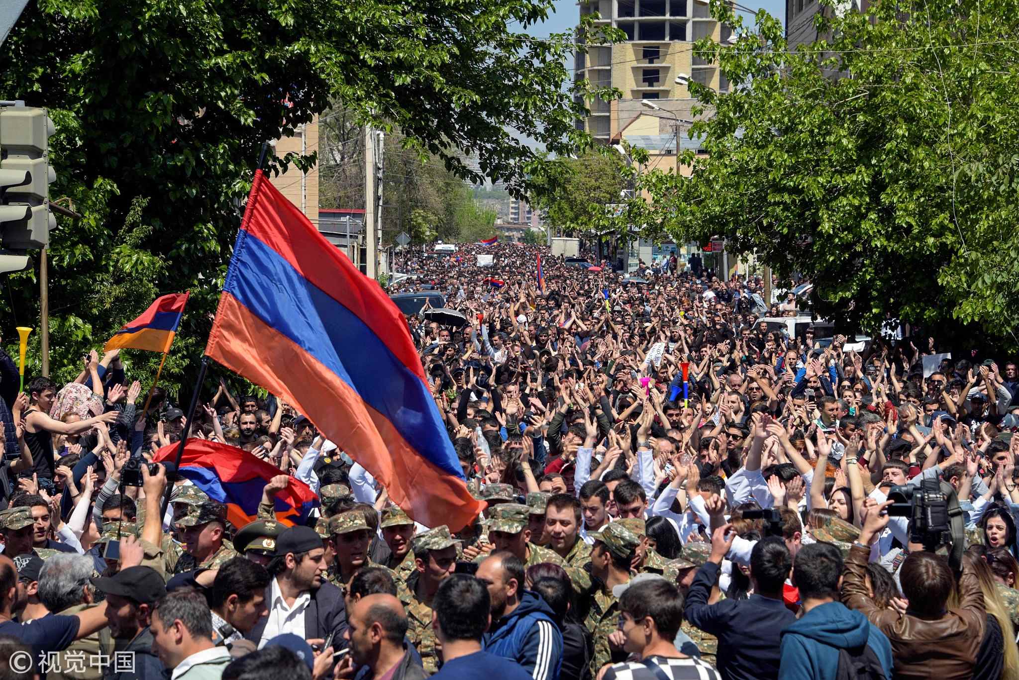 Demonstrators march through the streets of Yerevan to protest the former president's election as prime minister, April 23, 2018. /VCG Photo