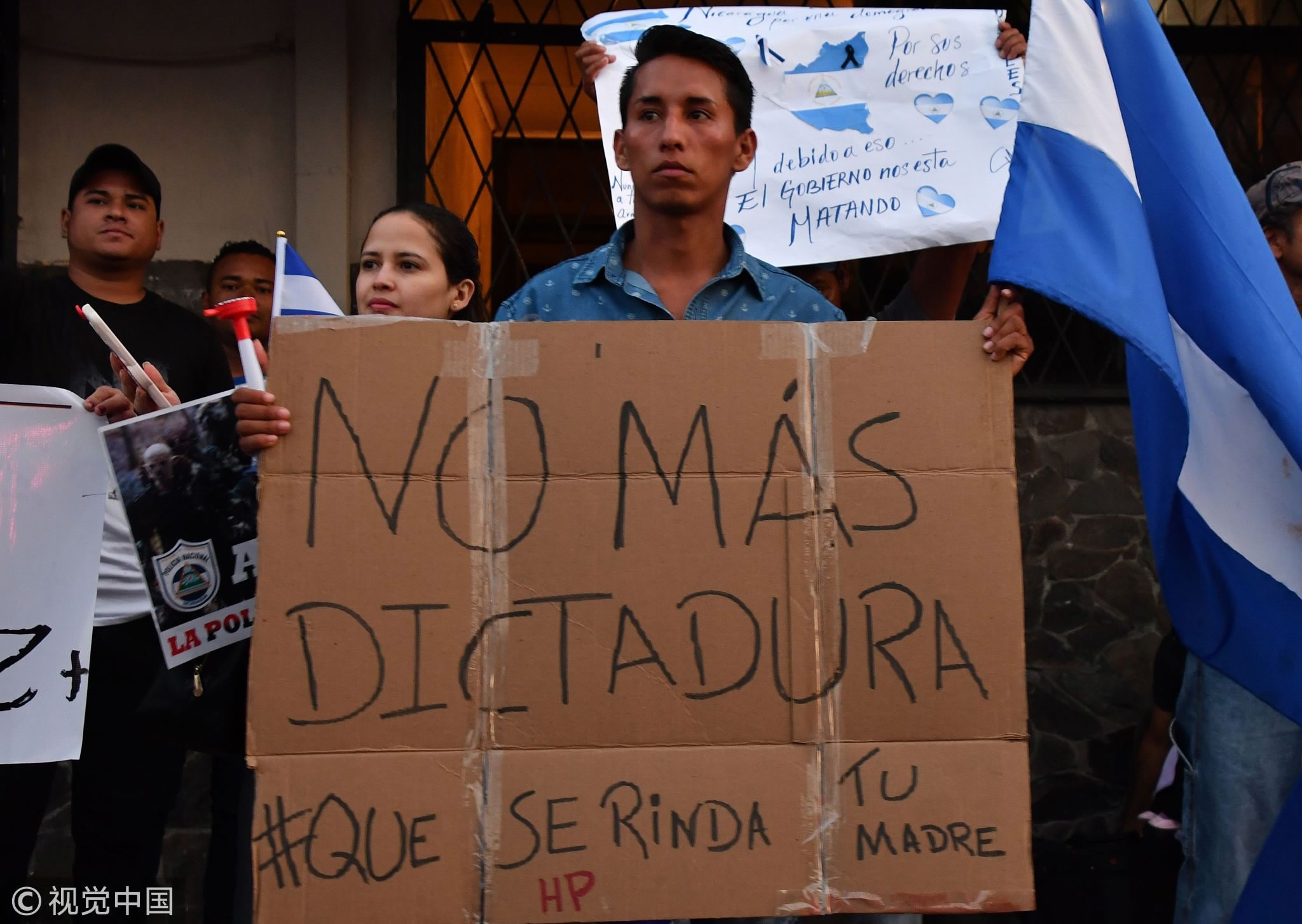 Nicaraguans living in Costa Rica demonstrate in front of the Nicaraguan embassy in San Jose April 23, 2018, in support of the protests taking place in their country against the government of President Daniel Ortega. /VCG Photo
