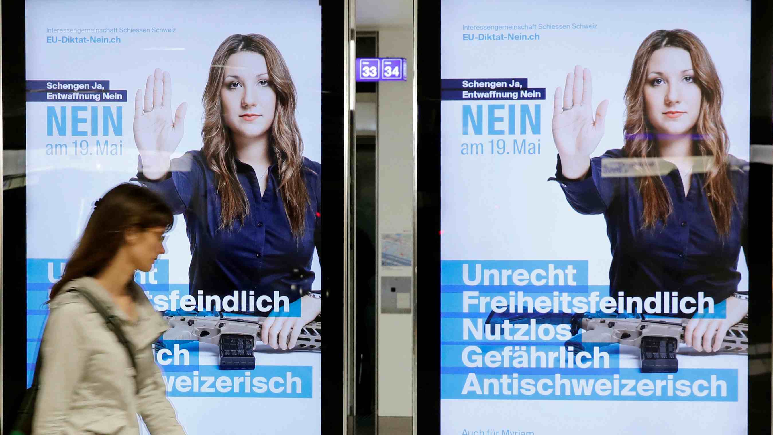 A woman walks past a display demanding the Swiss to vote "no" in the referendum on proposals to tighten weapons ownership laws in line with EU steps,