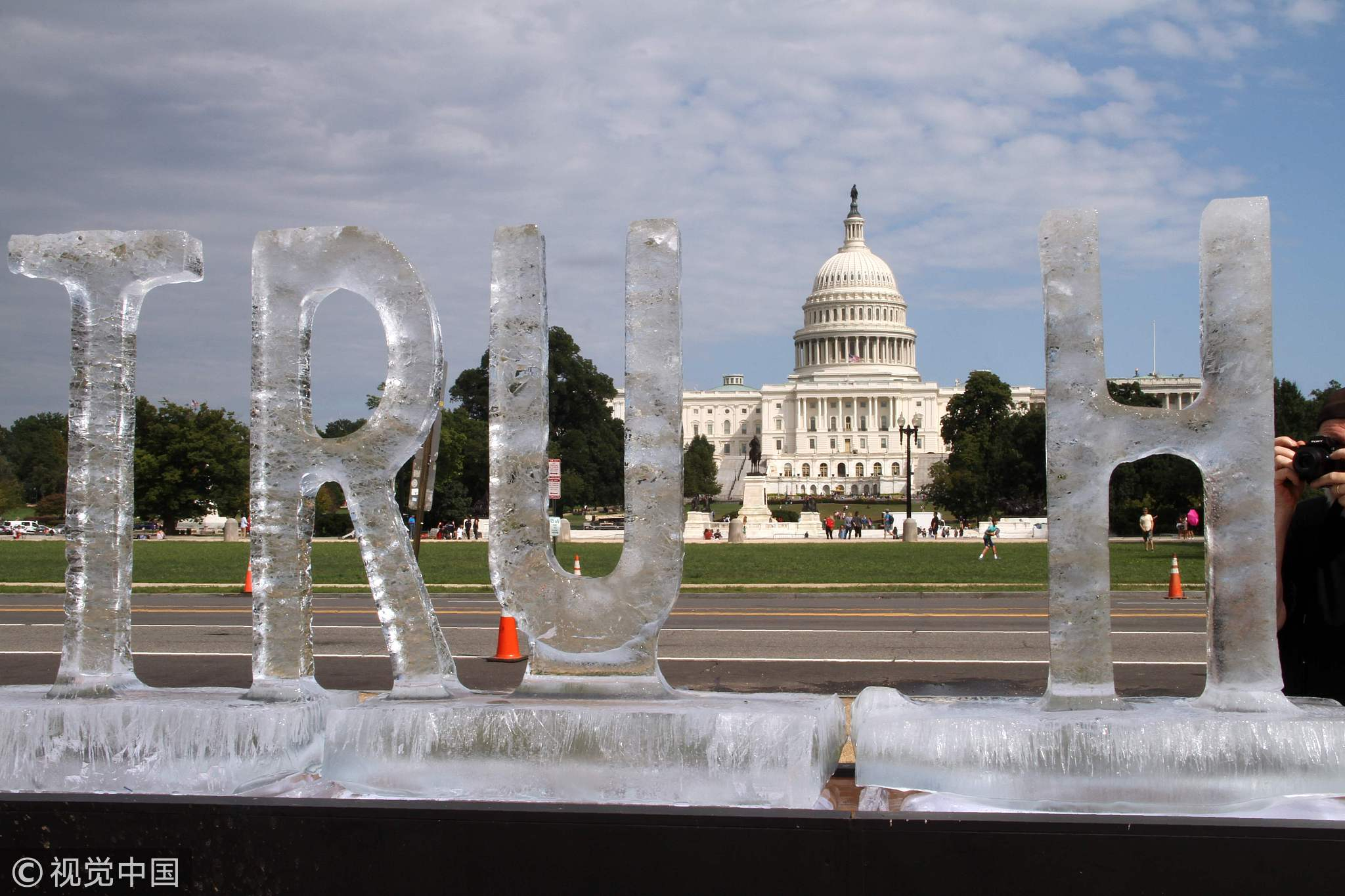 An ice sculpture is seen spelling out the word "truth" by artist duo Ligorano Reese, with the US Capitol in the background, in Washington, DC, on September 22, 2018./ VCG Photo