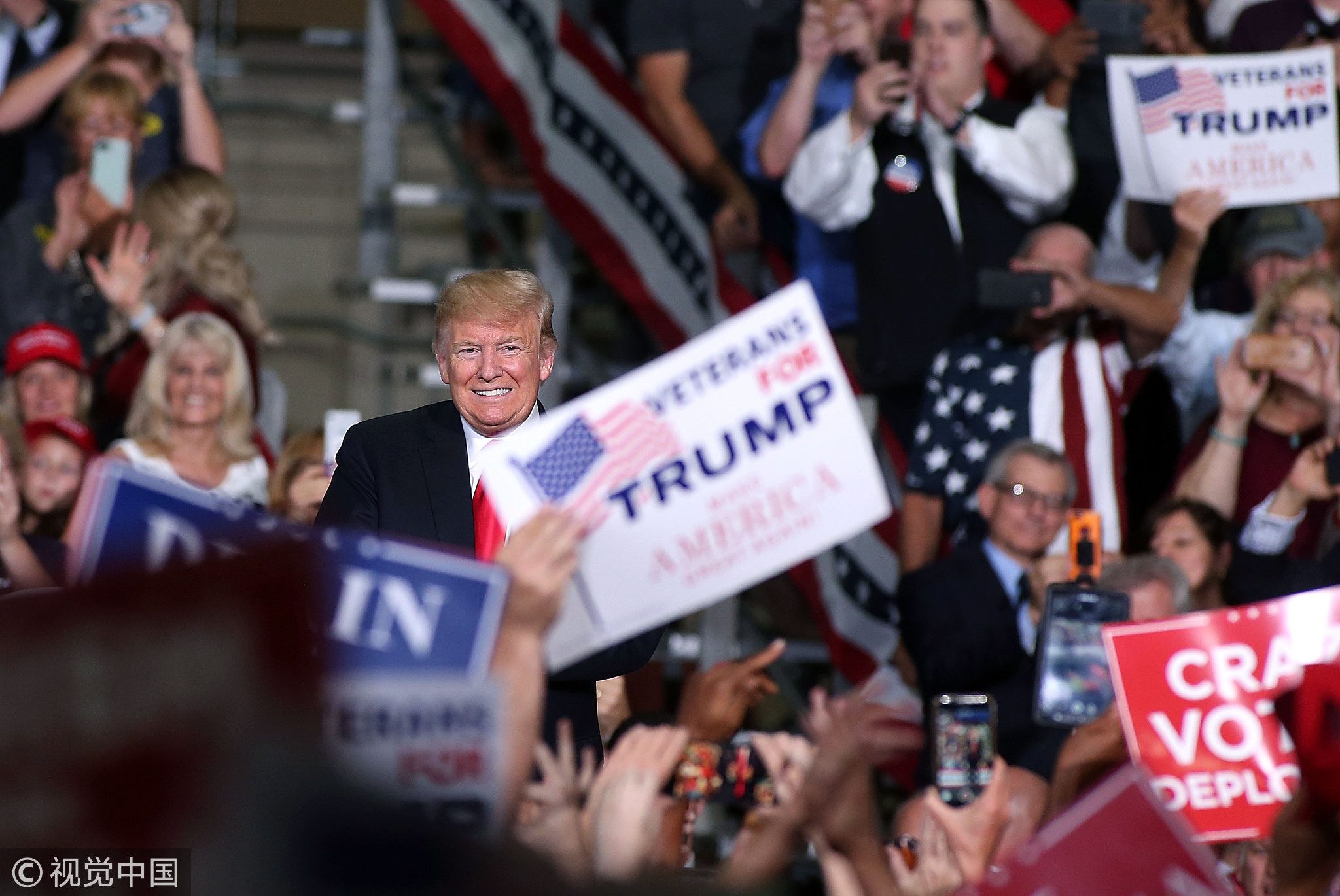 US President Donald Trump smiles as he arrives at a rally at the International Air Response facility in Mesa, Arizona, on October 19, 2018./ VCG Photo