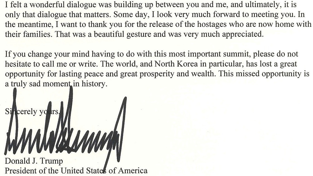 But Trump left the door open to meeting the DPRK leader in the future. "Some day, I look very much forward to meeting you," he wrote. "If you change your mind having to do with this most important summit, please do not hesitate to call me or write."