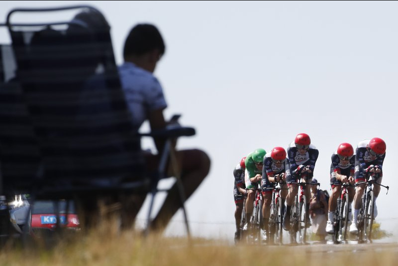 People watch as UAE Team Emirates with Norway’s Alexander Kristoff, wearing the best sprinter’s green jersey, passes during the third stage of the Tour de France cycling race, a team time trial over 35.5 kilometers (22 miles) with start and finish in Cholet, France, Monday, July 9, 2018. /AP Photo