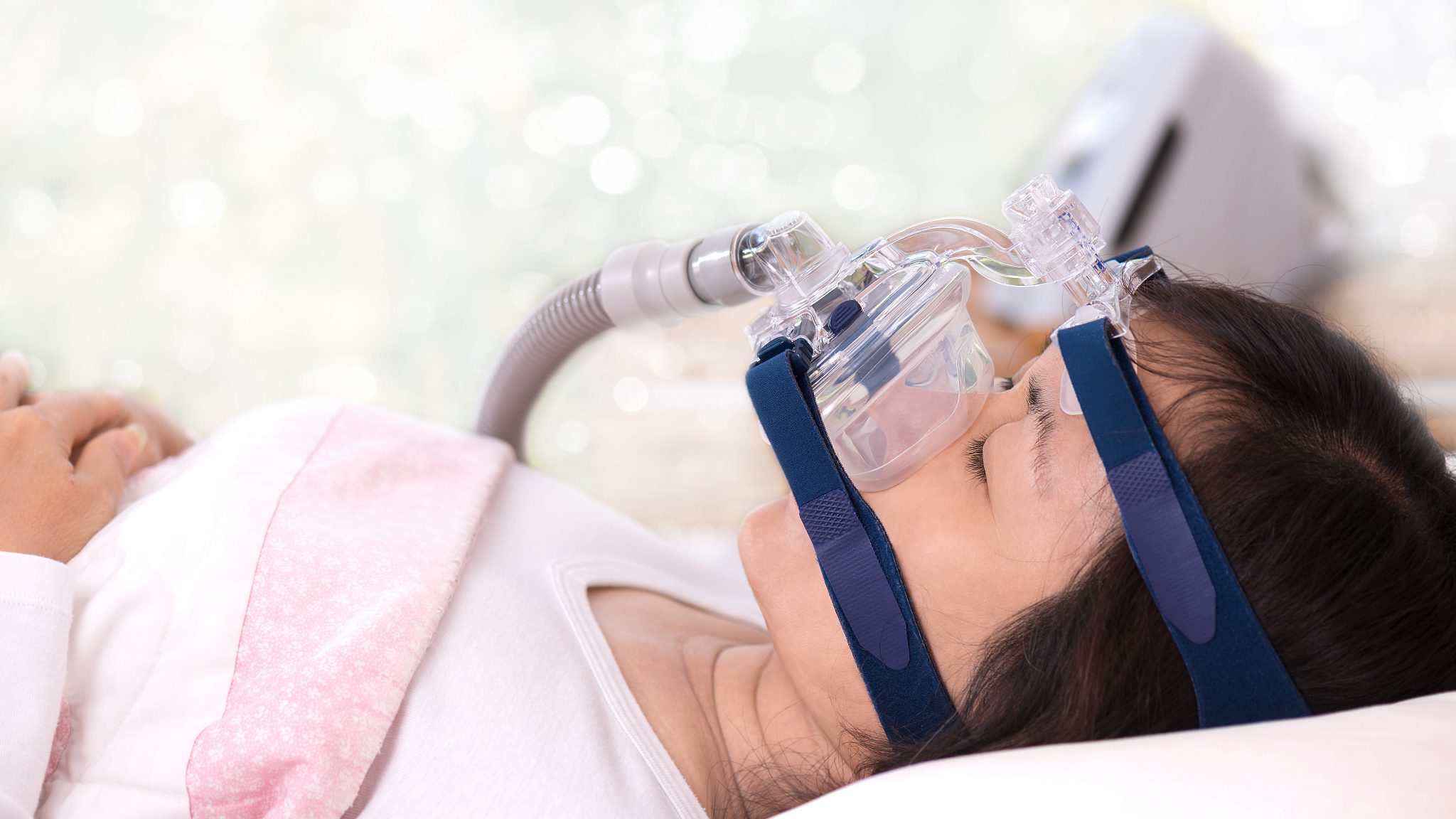 Patient wearing an oxygen mask while sleeping on bed in hospital /VCG Photo