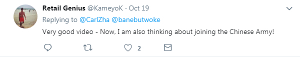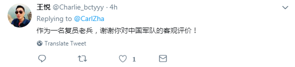 "As a veteran, I'm thankful for your objective view on the Chinese army!" Twitter user @Charlie_bctyyy responded to @Carl Zha who posted the original thread. /Screenshot from Twitter