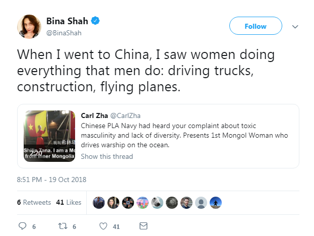 User @BinaShah shared why she was impressed with Chinese women in response to the interview video of the female Navy officer. /Screenshot from Twitter