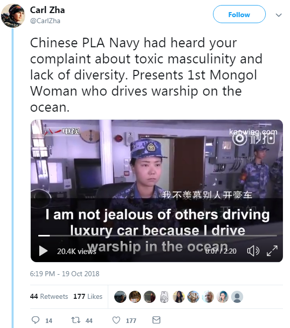 In response, the same Twitter user posted a video interview of a female Chinese Navy officer from Inner Mongolia, who demonstrated to a reporter how she managed to steer a warship at sea.